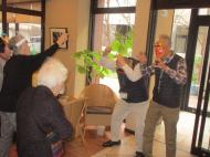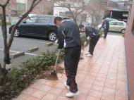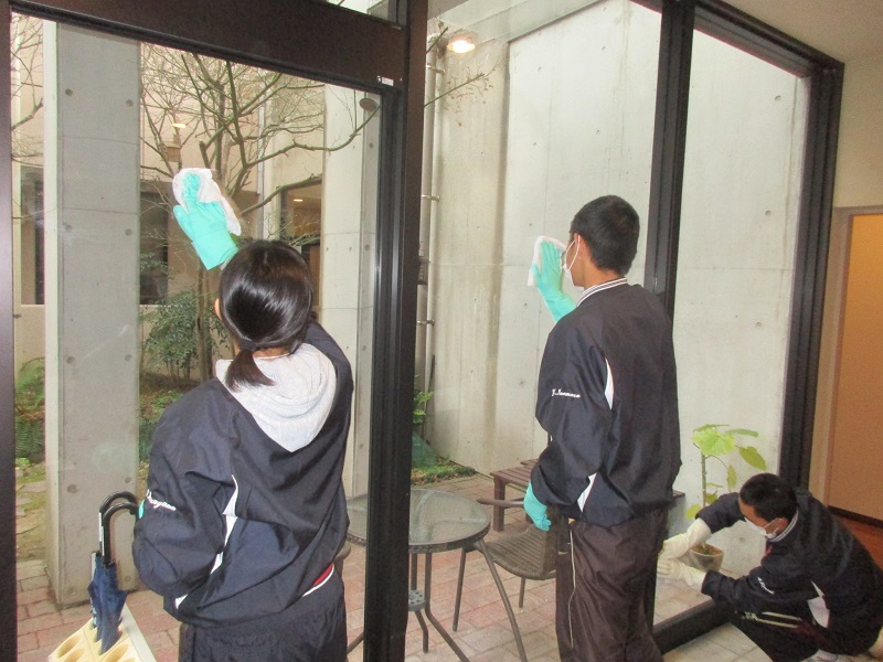 敷地内の落ち葉集めや窓ふきなどをお手伝いしてくれたあとは、入居者の皆様との交流会。