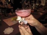 蘭の花が飾ってあり、紅梅の色で仕上げられたカクテルは
