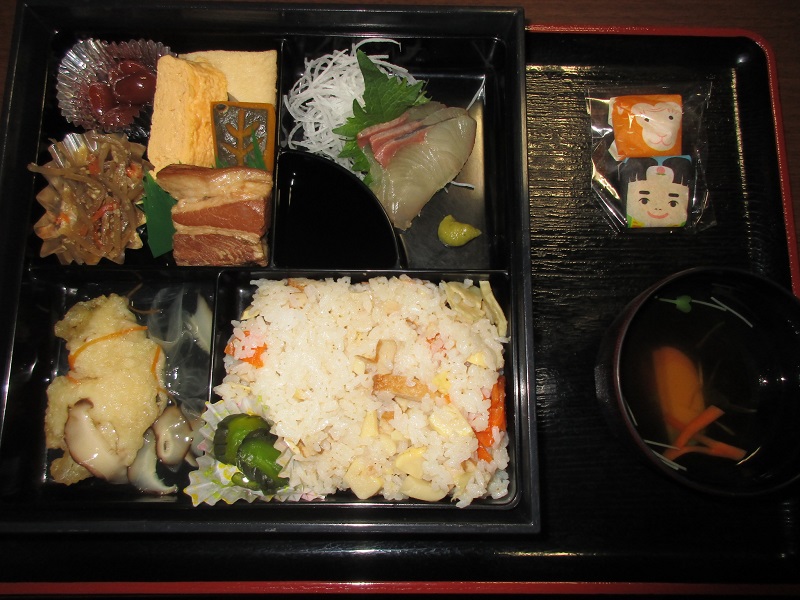 ハマチの刺身や筍ごはん、角煮など彩り豊かな内容で
