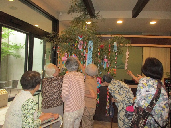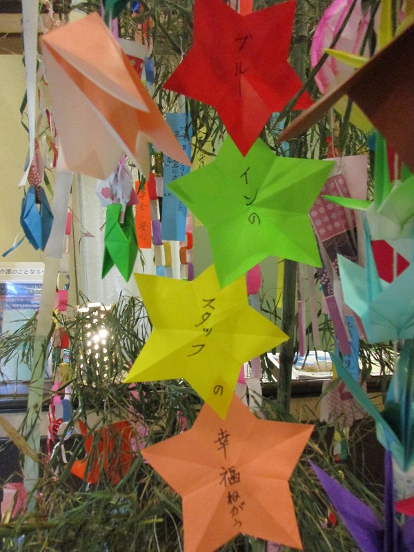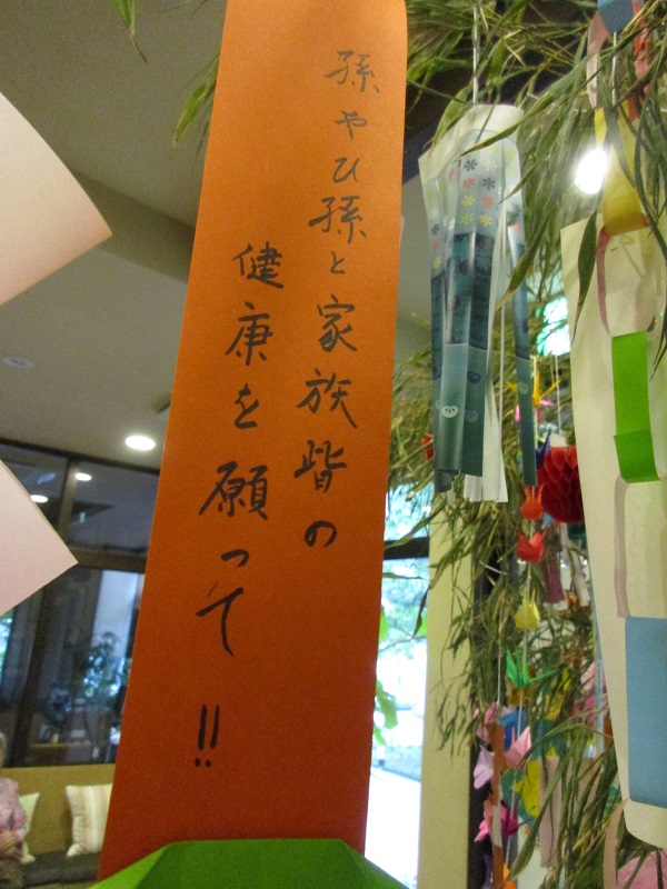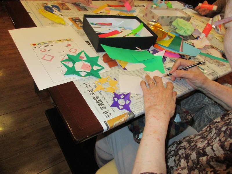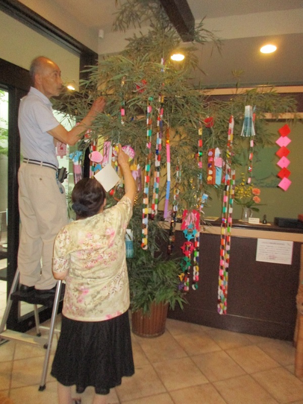 ご入居者様は思い思いに、提灯、吹流し、星かざり、やっこさん、輪っか等作成なさって、