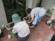 本日は梅雨空の下、ご入居者様と花壇づくりを楽しみました。