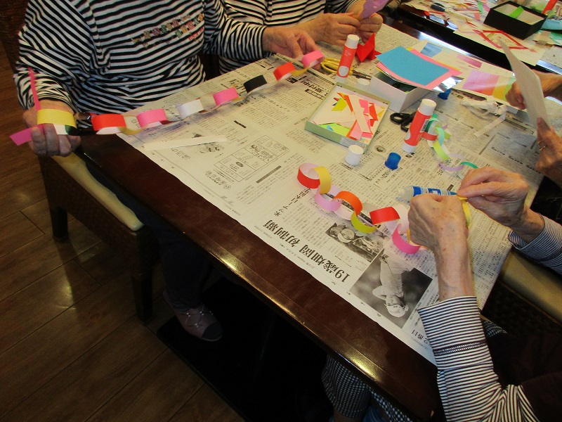 本日は午後より、ご入居者様と七夕飾りを作りました。