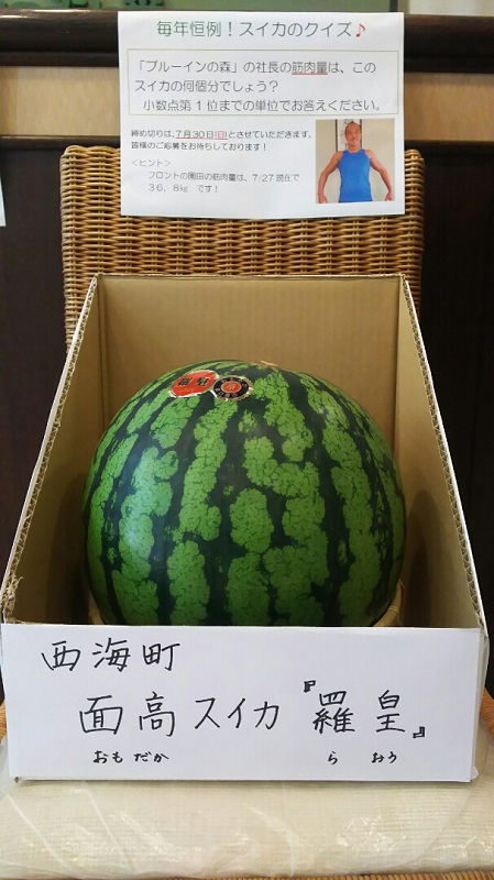 問題は、「ブルーインの社長の筋肉量は、このスイカの何個分でしょう?」という