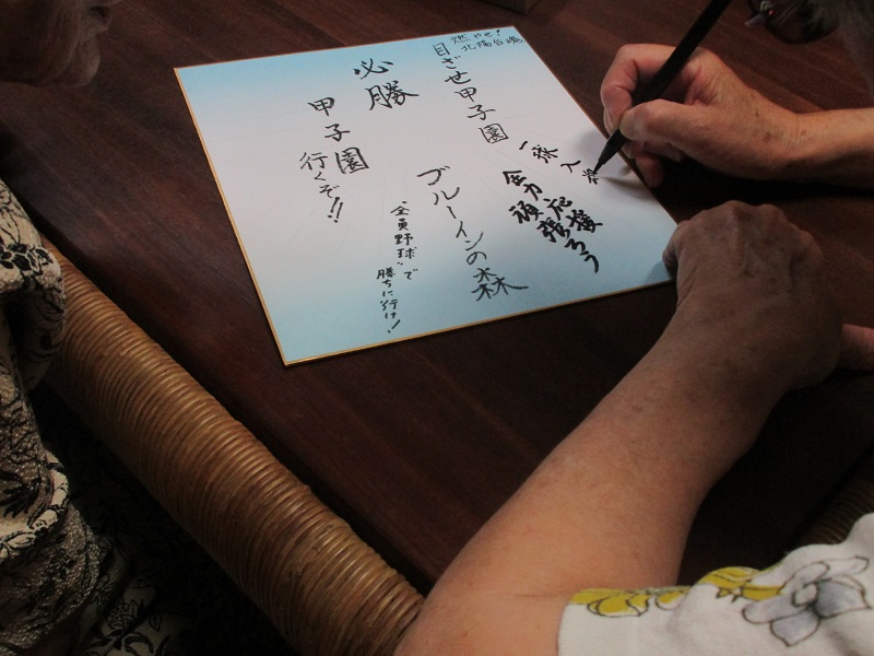 入居者のS様が「己を信じ、仲間を信じ、グラウンドいっぱいブルー旋風を巻き起こせ!」