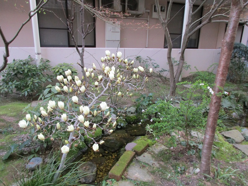 「開花」といっても、もちろんまだ桜ではなく、モクレンの話です。