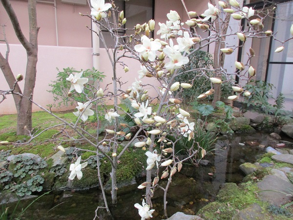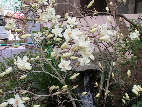 数日前より、エントランスの小川付近に突如「ハクモクレン」が咲きました。