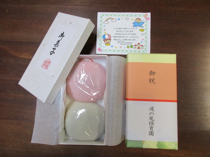 「無事卒園式を終えました」と、お祝いのお菓子を届けてくださいました。