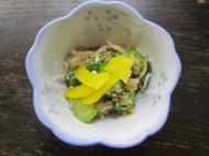 サッと湯通しし、ゴマ和えの上に少しあしらったものをお出しし