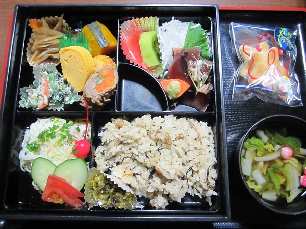 ご夕食は、素麺をメインとした、色とりどりの松花堂弁当。