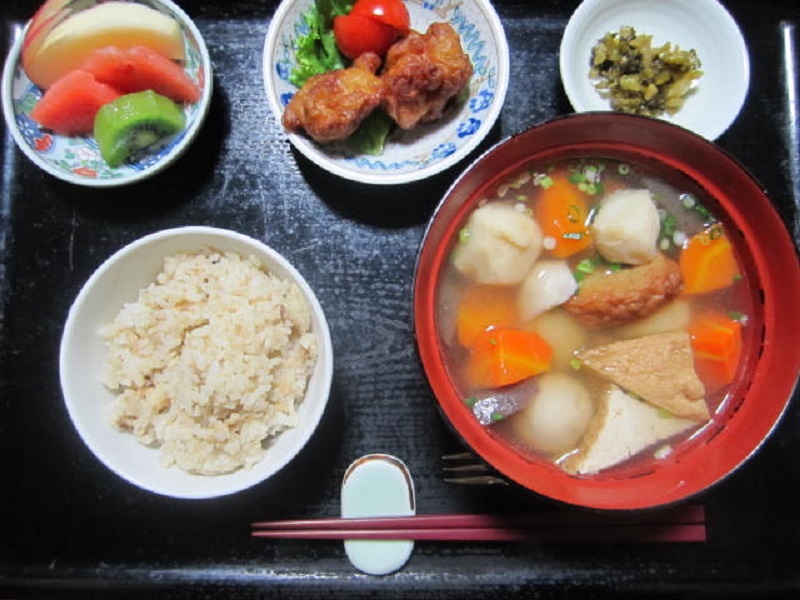 「鯖めし」、具沢山の汁物「いもたき」、「せんざんき」(鶏の唐揚げ)といったバラエティに