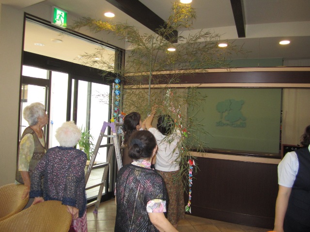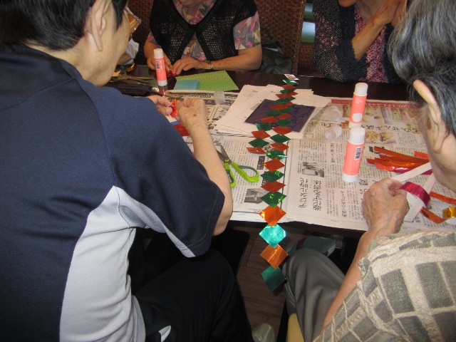 さて今日は、七夕を前に、皆様と賑やかに「笹飾り」を作りました。