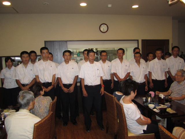Tくんに対し、入居者のO様が、日頃カラオケで鍛えた喉で「頑張れ、北陽台!目指せ、