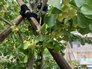 このイチョウ、すでに丸々とした実をつけており、早くも収穫が楽しみです!