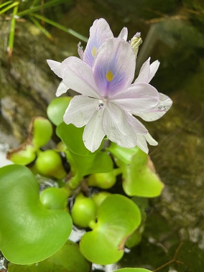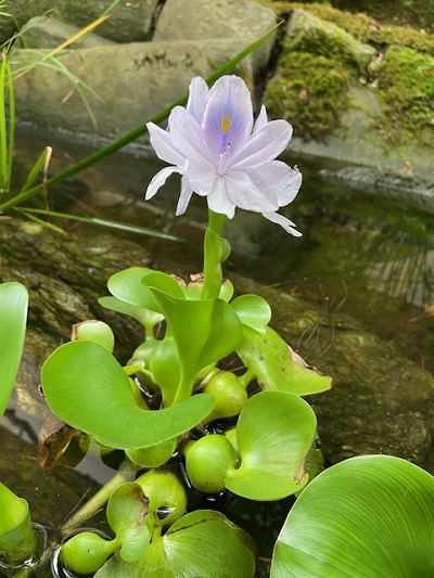 エントランスの小川に浮かべているホテイアオイに、花が咲きました!