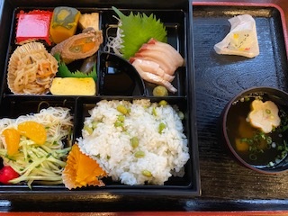 冷やしそうめん、ハマチのお刺身、煮物いろいろに枝豆ごはんなど