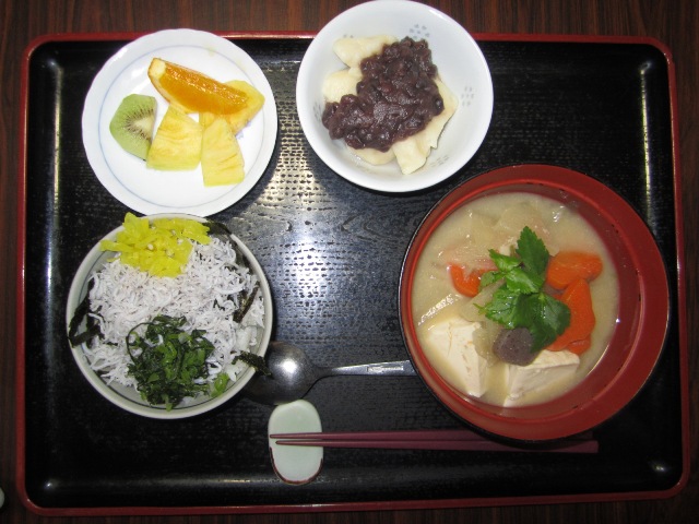 具沢山の「けんちん汁」、青高菜と刻みのり、たくわんのトッピングで色あざやかな「しらす御飯」、