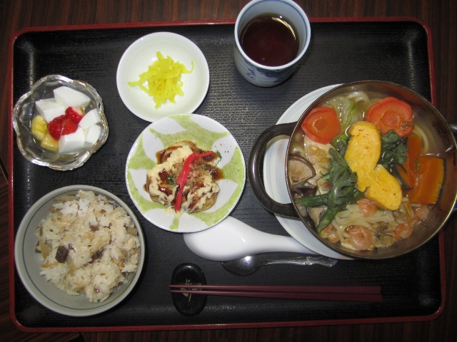 「うどんすき、具沢山で彩りも美しく、食べるのが勿体ないほど」