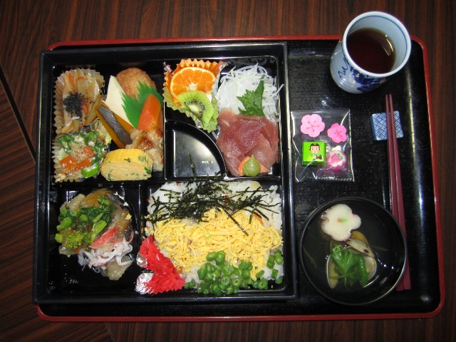 ちらし寿司、マグロの刺身、菜の花をあしらったアジの酢漬け、