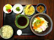 たまかけうどんは、麺に溶き卵とだしをからめて、お好みでえび天、天かす、しいたけの
