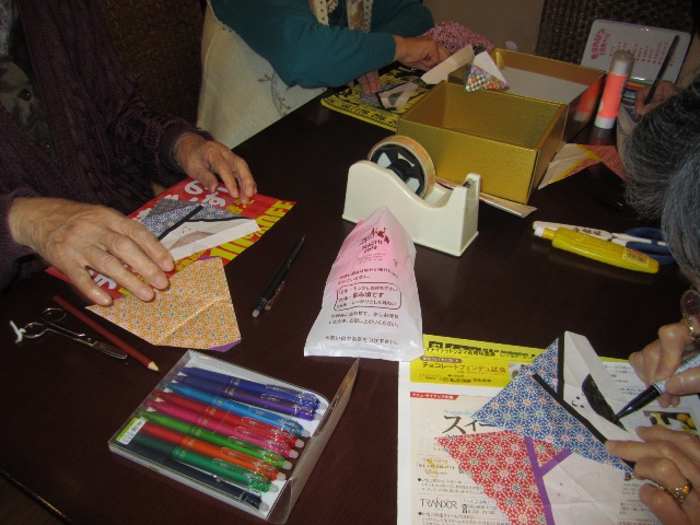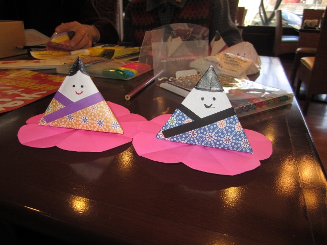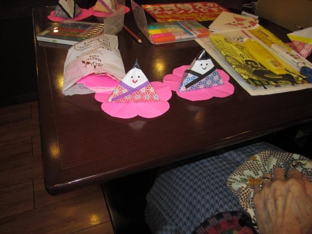 今日は、来月の桃の節句を前に、皆様と折り紙で雛人形を折りました。