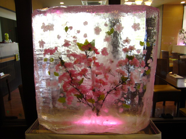 生花のソメイヨシノはもちろん、桜を仕込んだ氷のオブジェ