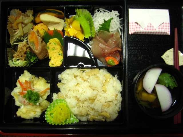 筍ごはん、ハマチの刺身などの松花堂弁当をお楽しみ