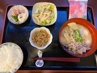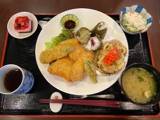 焼うどん、おにぎり🍙、野菜のフライにポテトサラダと賑やかな内容で