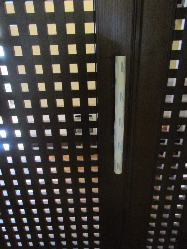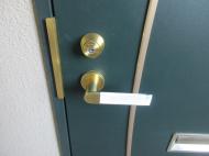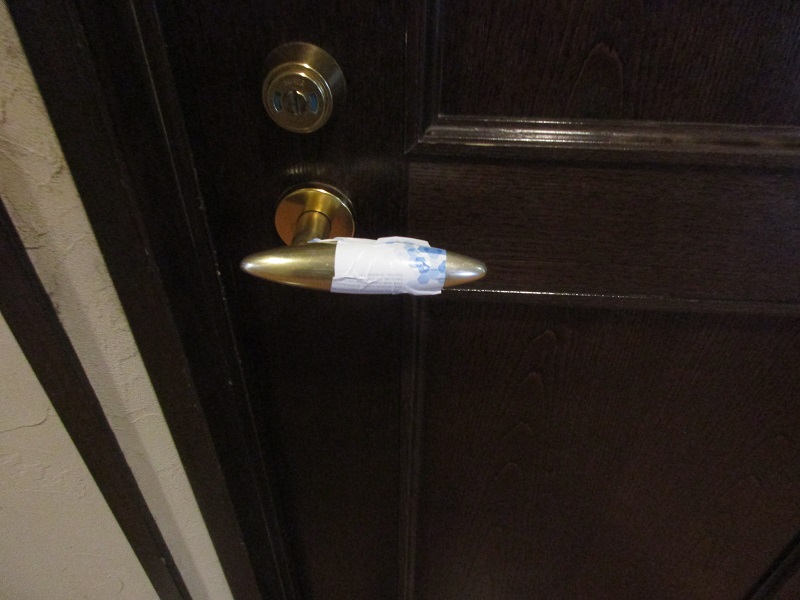 新型コロナウイルスの感染拡大を受け、先日より入居者の皆様のお部屋のドアノブをはじめ、エレベーターのボタンや手すり、共用トイレのドアノブなどに「接触感染対策テープ」を貼付しております。