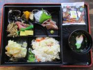 松花堂弁当は、筍御飯、ハマチのお刺身、白身魚の野菜あんかけ、玉子焼き、煮物等